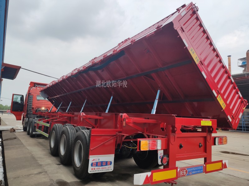 好消息:歐陽華俊側翻自卸半掛車有剛做好的現車啦,來了即可提車,不耽誤大家拉貨賺錢! 無論是輕量化側翻自卸還是普通側翻自卸,其在砂石料運輸中發揮作用都是同等的效果,只是有些司機朋友平時在貨源短缺的情況下,可以作為欄板使用,那輕量化側翻就突出了優勢。 側