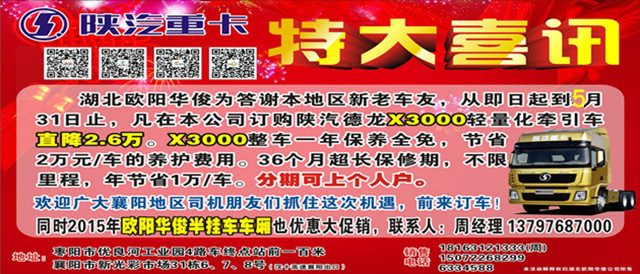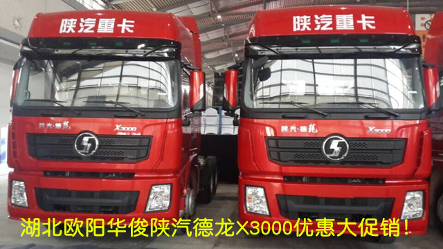 特大喜訊:湖北歐陽華俊專用汽車有限公司為答謝新老車友們,從即日起到5月31日,凡在本公司訂購陜汽德龍X3000輕量化牽引車直降至東風天龍車的很低價,用西安康明斯發動機,比東風天龍配置高,價格優;比解放J6更省油保養更省錢。陜汽德龍X3000一年保養全免,節省2萬元/年的養護費用。36個月超長保修期,不限里程,年節省1萬/年。本公司可分期付款辦理上個人戶。