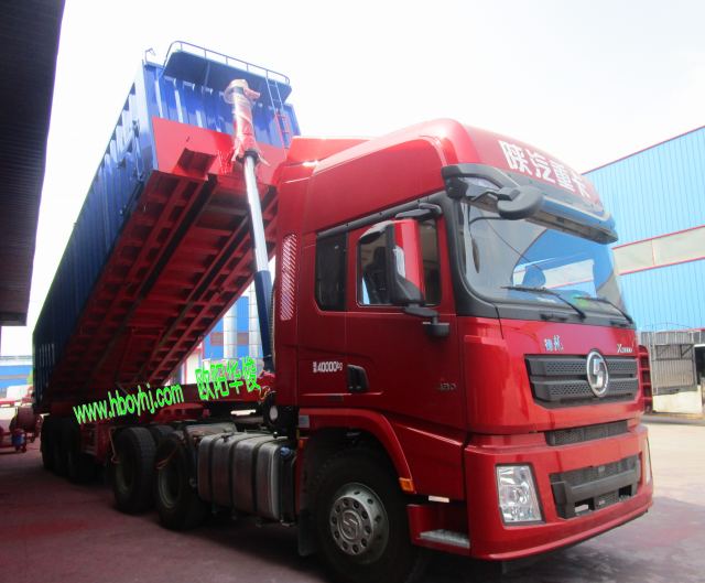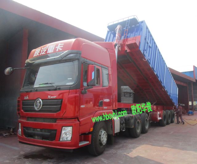 發布日期:2016-08-27 16:28:42 編輯:歐陽華俊 瀏覽量:4970歐陽華俊9.5米平板集裝箱后翻自卸半掛車,配陜汽德龍X3000超強版430馬力牽引車完工交付,這臺后翻自卸半掛車的尺寸為:9.5米長×2.5米寬,箱子的尺寸為:9米長×2.5米寬×2米高。