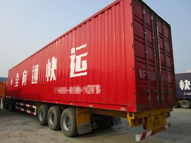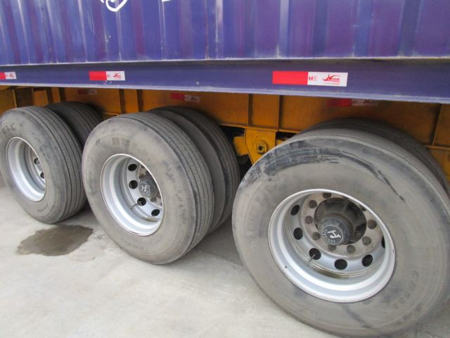 2臺骨架集裝箱半掛車:1臺為藍色,1臺為紅色。骨架式半掛車尺寸為:14.95米長×2.5米寬,上面集裝箱車廂尺寸為:16.5米長×2.8米寬×2.78米內高。它們配的是質量好的液壓支腿,使用的是廣州華勁13T+16T車橋,真空三包輪胎配套正興900鋼圈。