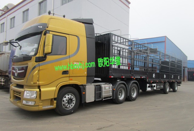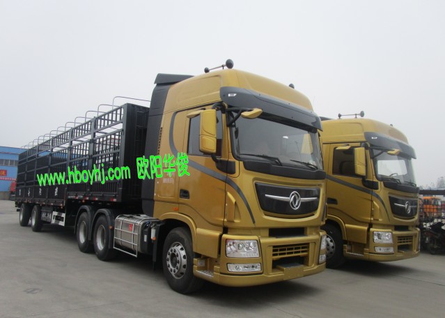 兩臺13米高低板全新倉欄半掛車完工交付啦,配兩臺東風天龍牽引車土豪金色的,美到驚艷!此車是2.2米高,用的是廣東的富華車橋,客戶要求做的是亮灰色,整體非常壯觀。---《湖北歐陽華俊專用汽車有限公司歡迎您!》