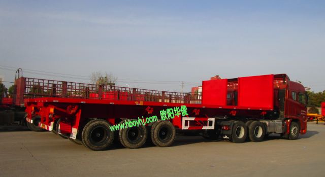 發布日期:2016-03-29 14:29:22 編輯:歐陽華俊 瀏覽量:24063臺11米低平板自卸半掛車完工交付啦!此3臺車廂的尺寸為11米長× 2.5米寬,用來拉50-60噸左右的石頭或大理石使用。平板上面可加1.8米高的集裝箱,做成側翻自卸半掛車樣式,方便客戶裝卸貨物,平板式側翻自卸半掛車是建筑工地上的選擇車型之一!