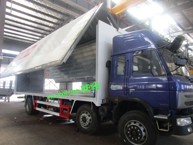 飛翼車又稱為兩翼車、翼展車、翼開啟廂式車。該車兩翼側板可升降,并有防雨、防塵、防曬、防盜、耐腐蝕等優點,是現代物流企業十分青睞的運輸工具,具有裝卸速度快、效率高等特點。工作原理是通過電瓶放電經動力單元推動液壓系統工作達到舉升的作用。舉升高度可超過車廂,接近90度角。歡迎來電咨詢:13396117366,13367109288 《湖北歐陽華俊專用汽車有限公司歡迎您!》