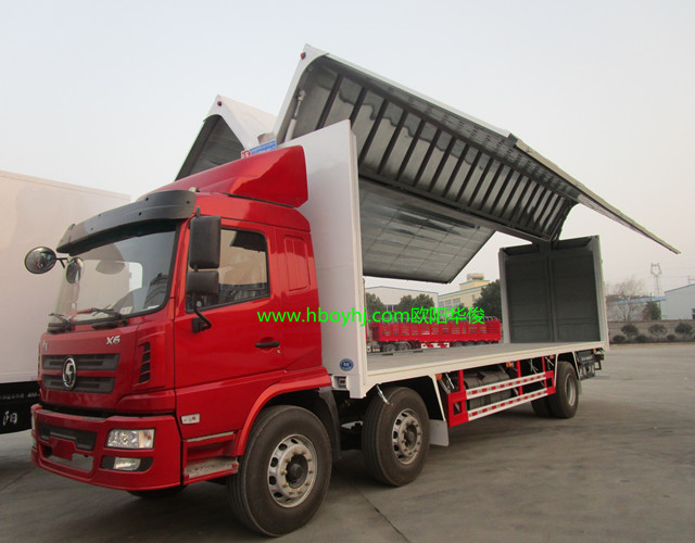 翼開啟廂式半掛車,是普通廂式車的改進,通過動力彈簧、手動裝置或液壓裝置,能開啟車廂兩側翼板的專用車輛,該車頂部、前板后門結構同鐵瓦楞廂式車,側邊由翻轉板、上邊板、下邊板組成。由于其具有裝卸速度快,效率高,可側面裝卸等優點,已經是現代物流企業十分青睞的運輸工具。由于近幾年,大量輕質新材料應用于翼展車系列,使得車廂自重降低,加之車廂設計美觀,貨物運輸安全可靠,已成為大型物流公司運輸的很佳選擇。