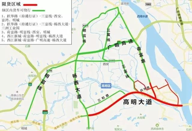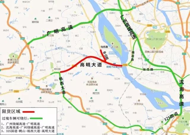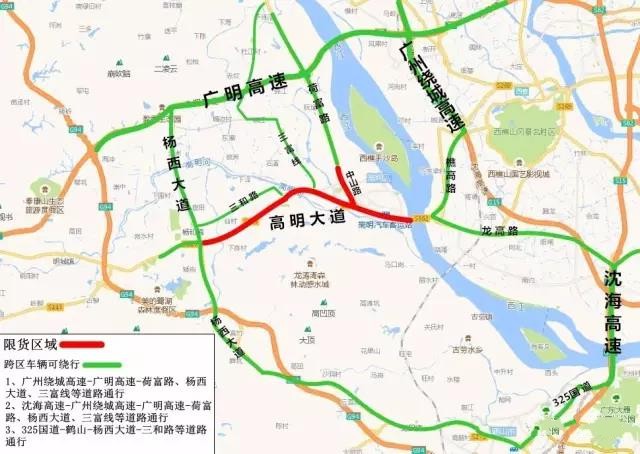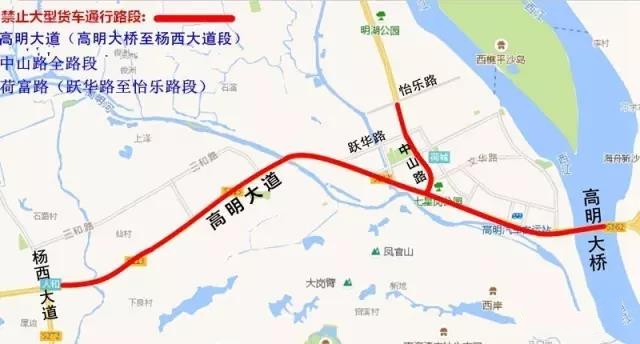 2017年10月15日至2019年12月31日,對高明大道(高明大橋至楊西大道段)、中山路全路段以及荷富路(躍華路至怡樂路段)實施全天24小時禁止大型貨車、專項作業車通行。(本文中提到的大型貨車是指中型或重型貨車、半掛牽引車、全掛牽引車。)