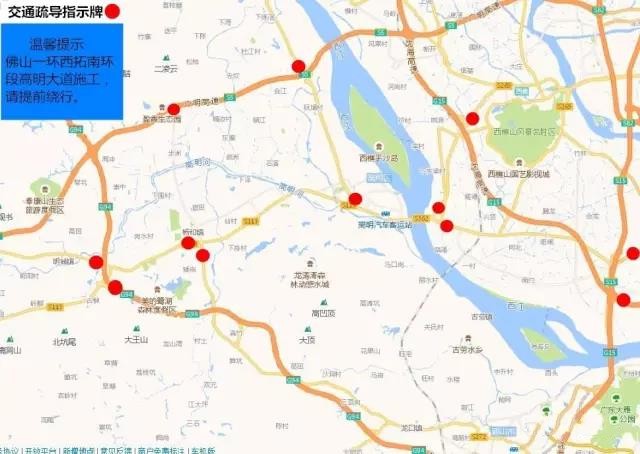 官窯互通(西二環)、大崗互通(廣明高速)、九江互通(佛開高速)、廣明高速荷城、廣明高速西安出口、廣明高速明城出口、譚朗立交(廣明高速與江肇高速交匯)、江肇高速楊和出口、江肇高速明城出口、楊西大道與高明大道交匯處、龍高路進入高明大橋前、樵高路進入高明大橋前。