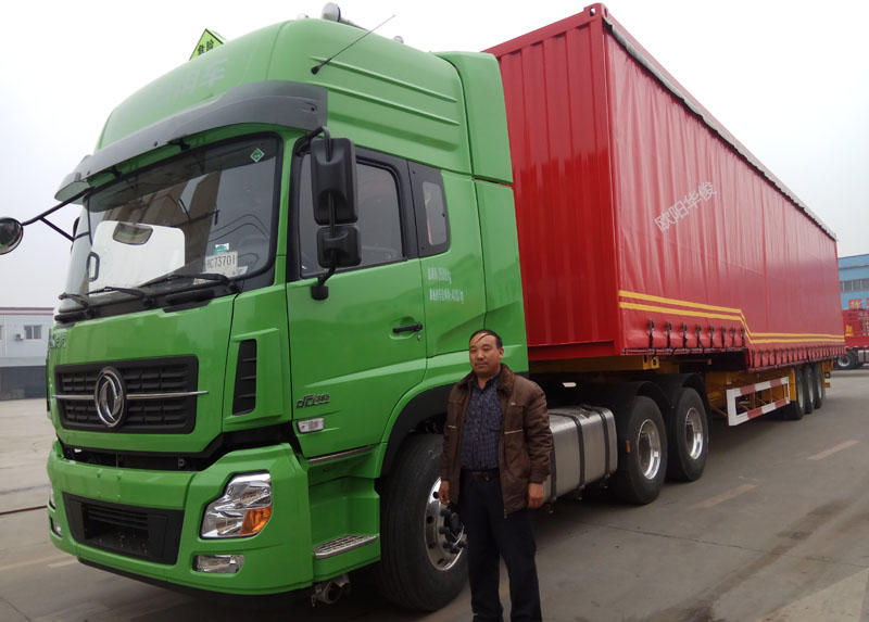 3臺骨架半掛車配直梁式側簾篷布廂式半掛車完工交付給客戶張總,骨架半掛車顏色為工程黃,篷布側簾車廂為紅色。此骨架半掛車的尺寸為:13.95米長×2.5米寬;上裝篷布車廂尺寸為:15.2米長×2.6米寬×2.75米內高。后門為廂式對開門,廂體內打井字形隔開,每邊焊15個臥環(huán)。該車廂曾經成為國外公路貨物運輸中的主導車型,也是當前廂式運輸車開展的一大趨向。