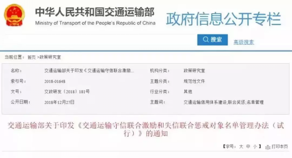 2019年1月初,交通部發布了關于印發《交通運輸守信聯合激勵和失信聯合懲戒對象名單管理辦法(試行)》(下文簡稱《辦法》)的通知,通知中對于治超做了專項部署,并規定該《辦法》發布之日即實行,有效期5年。