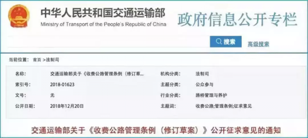 2018年12月20日,國家交通運輸部門在官方網站上公布了《收費公路管理條例(修訂草案)》,并開始為期一個月的公開意見征集。