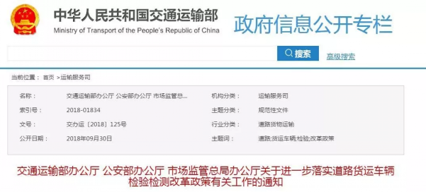 2018年9月30日,交通運輸部辦公廳聯合公安部辦公廳和市場監管總局辦公廳發布《關于進一步落實道路貨運車輛檢驗檢測改革政策有關工作的通知》。