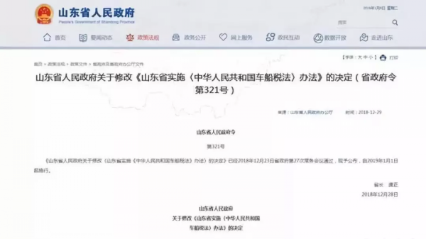 2019年1月初,山東省政府公布了修改后的《山東省實施〈中華人民共和國車船稅法〉辦法》,自2019年1月1日起,貨車、掛車、專用作業車、輪式專用機械車的車船稅適用稅額降低至原稅額的一半,分別為:36元、18元、36元、36元。