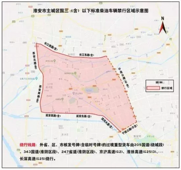 2019年1月21日,淮安市公安局發布通告稱,自2019年3月1日起,長江東西路(含)以南,西安南北路(含)以東,延安東西路(含)、濱河大道(含)以北,寧連公路(不含)以西合圍區域道路,全天禁止國三(含)標準以下柴油車輛通行。
