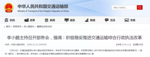 2018年11月交通部又出臺了《關于深化交通運輸綜合行政執法改革的指導意見》,明確了2019年交通綜合執法改革的重點: