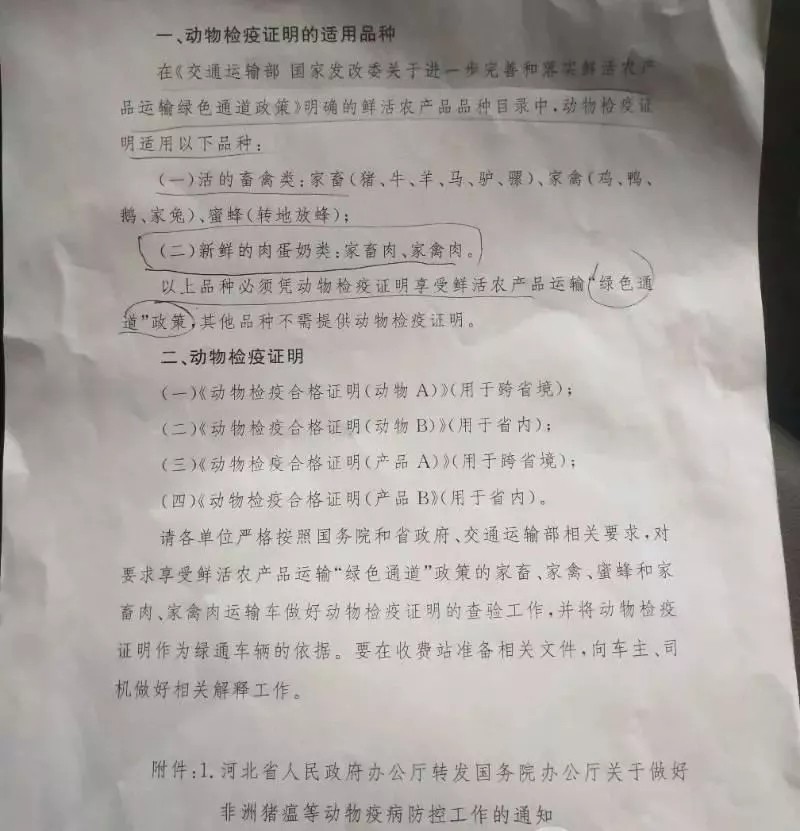 以下為卡友拍攝的《河北省交通運輸廳關于印發畜禽及其產品運輸車享受鮮活農產品運輸“綠色通道”政策必須提供的動物檢疫證明適用品種及式樣》文件內容: