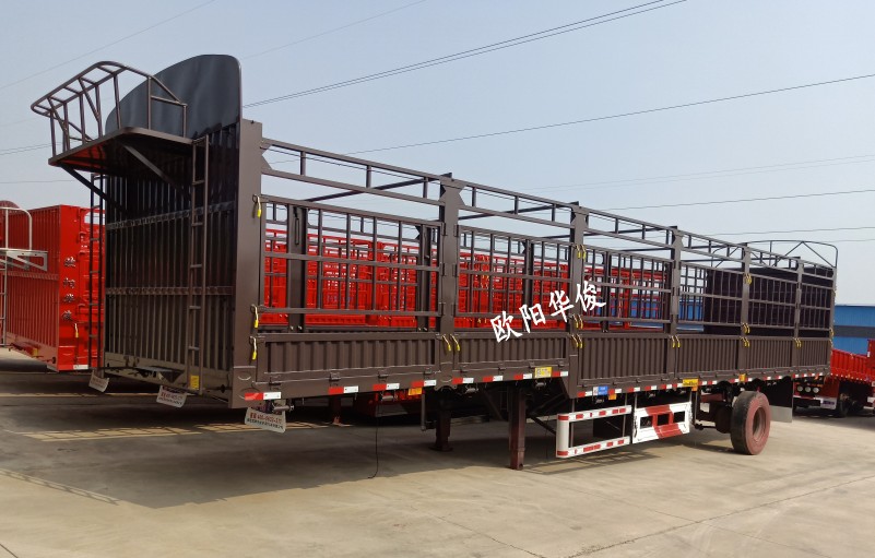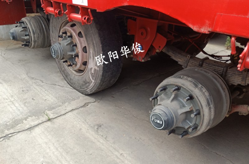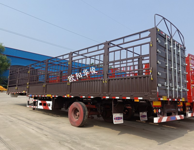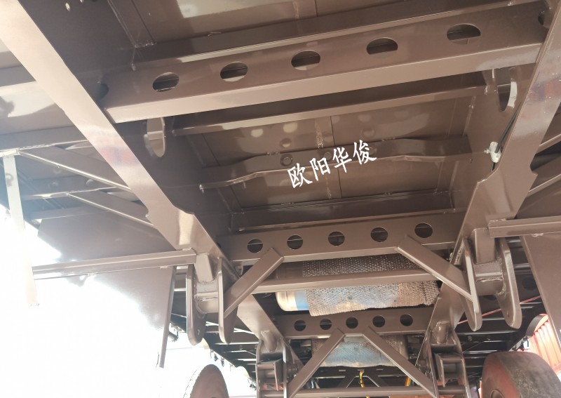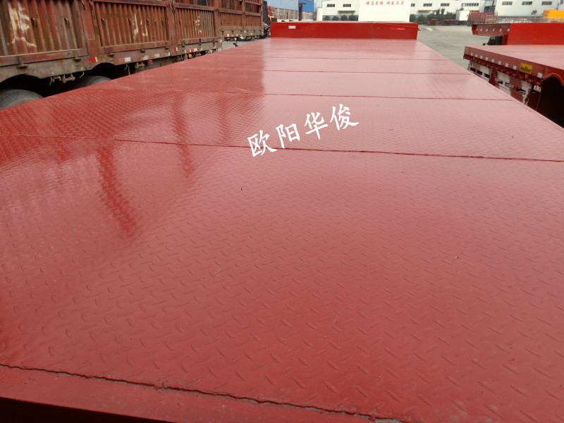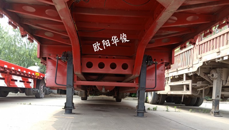 此車13.75米長×3米寬,配等寬戶口一套,顏色:華俊大紅,28T單動支腿,廣東富華13T車橋,16T剎車,板簧:10×13,底板:2.5mm花紋板,貫穿梁8#槽鋼,鋪9根底槽,可走叉車及拉重載。
