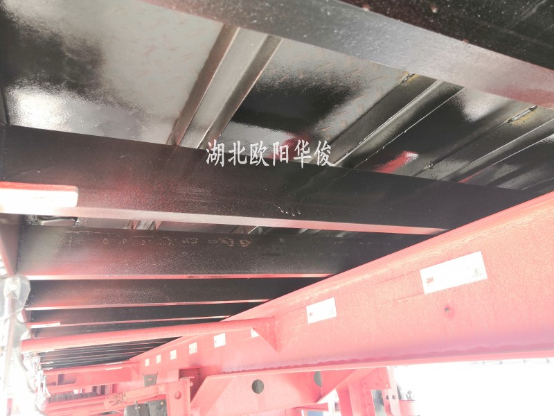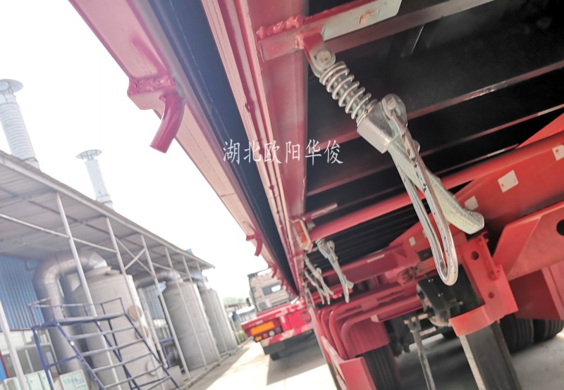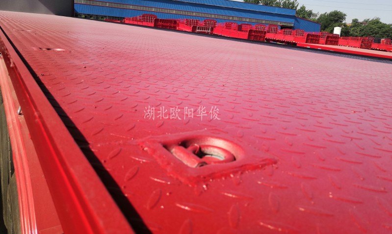 小細節放大:每邊裝有彈簧扣13個,固定兩邊的飛翼側板;底板采用3個厚的花紋板,上面每邊焊有13個臥環,固定里面貨的物。