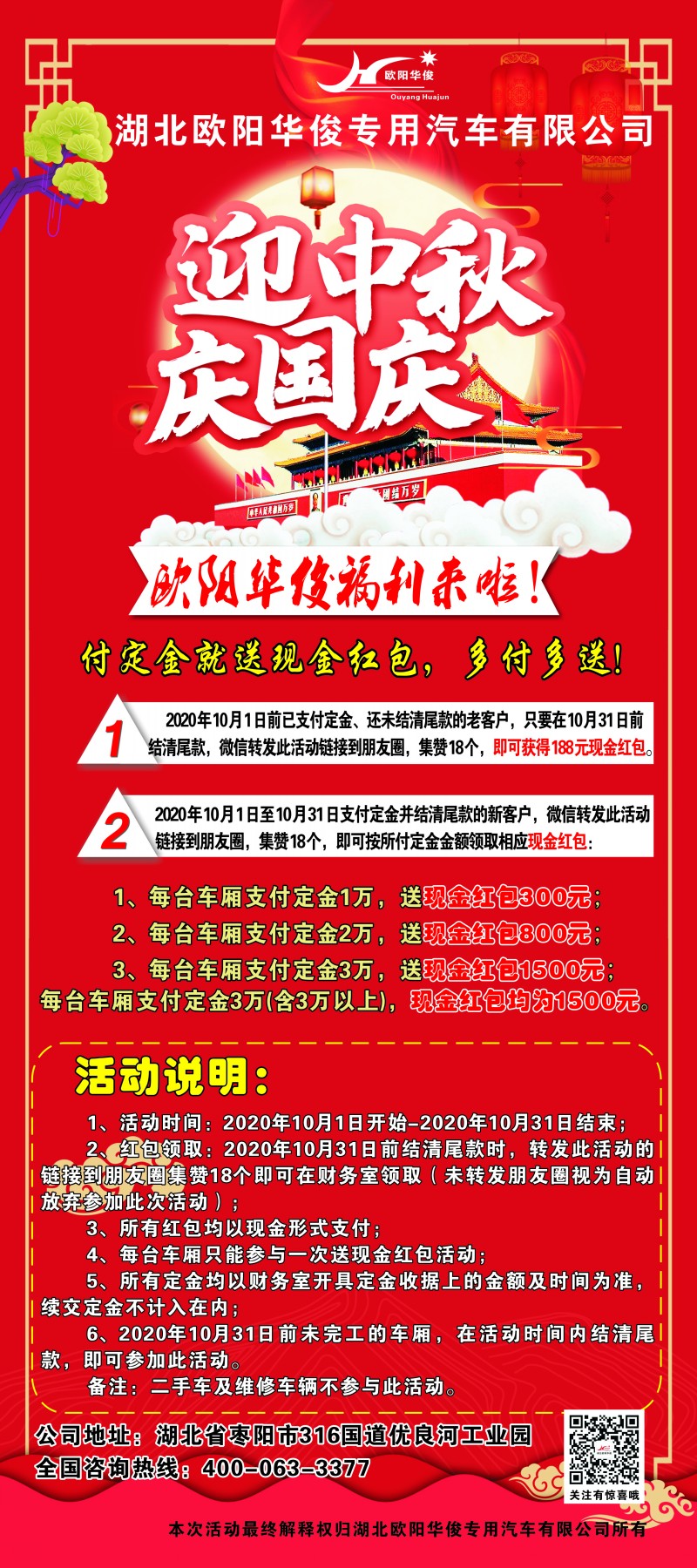 溫馨提示:歐陽(yáng)華俊訂掛車付定金送現(xiàn)金紅包優(yōu)惠活動(dòng)于2020年10月31日正式結(jié)束,再次感謝大家對(duì)湖北歐陽(yáng)華俊專用汽車限公司的大力支持和關(guān)注!
