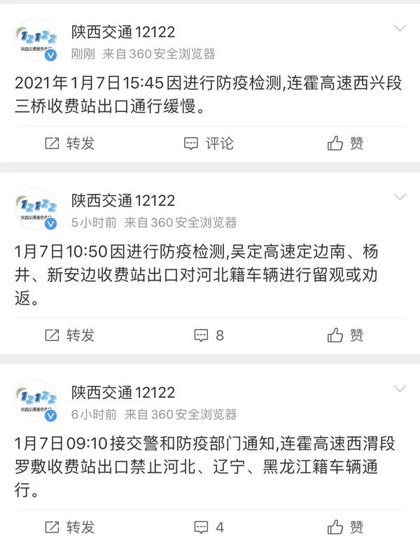 因進行防疫檢測,吳定高速定邊南、楊井、新安邊收費站出口對河北籍車輛進行留觀或勸返。連霍高速西渭段羅敷收費站出口禁止河北、遼寧、黑龍江籍車輛通行。