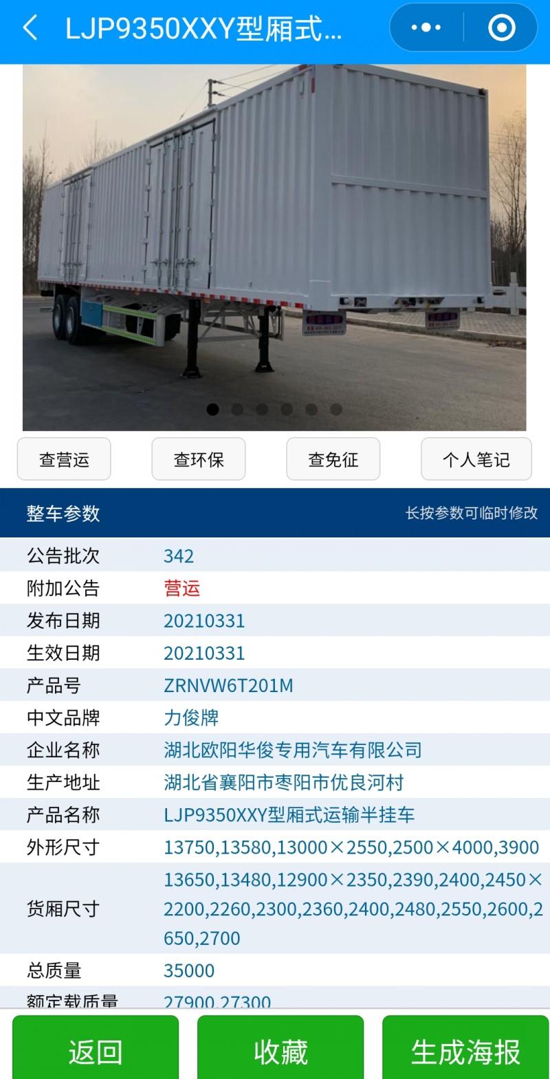 發布日期:2021-05-15 11:46:50 編輯:歐陽華俊 瀏覽量:1873好消息:湖北歐陽華俊專用汽車有限公司的廂式半掛車營運檢測于2021年3月已公示出來,需要13米,13.58米,13.75米長的兩軸廂式半掛車的卡友們有福啦!此款為鋼板橋配置,直梁式或鵝頸式任A選全國各地可上新戶。全新工藝升級,現集裝箱類的半掛車底板采用高質量的竹木底板,在滿足可上叉車的同時減輕整車的重量!