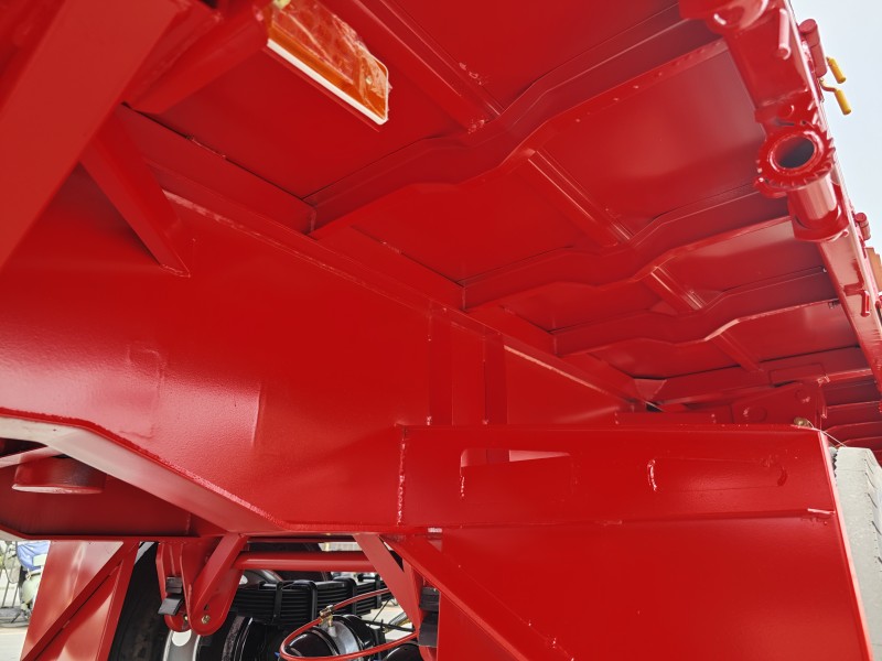 此側(cè)翻自卸現(xiàn)車為小鵝頸設(shè)計,橫梁采用新款高強鋼的5道彎打斷鋪3根小底槽