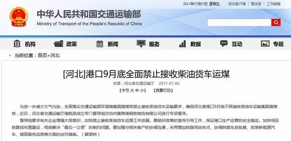 卡友注意啦!河北交通廳發(fā)布:為減少大氣污染,港口9月底全面禁止接收柴油貨車運煤! 2017-07-11